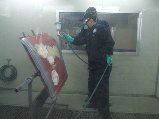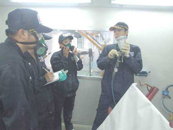 老師們?cè)诳酒岱績(jī)?nèi)實(shí)操噴槍對(duì)鈑件進(jìn)行底漆噴涂作業(yè),宋老師耐心指導(dǎo)