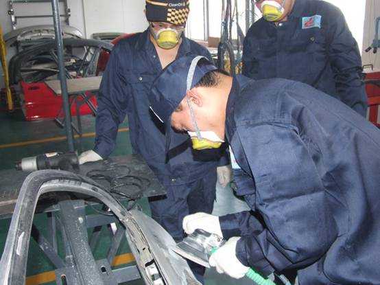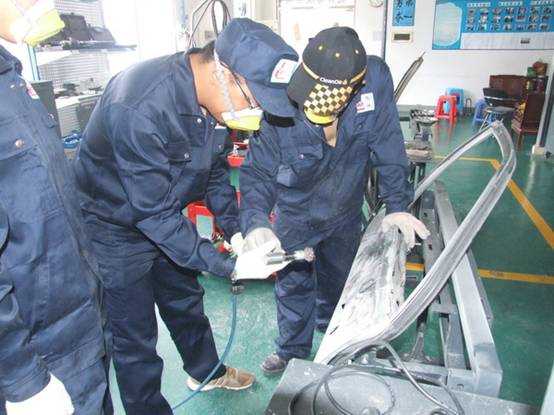 老師們實(shí)操磨灰機(jī)進(jìn)行車身修復(fù)