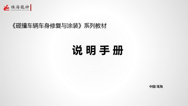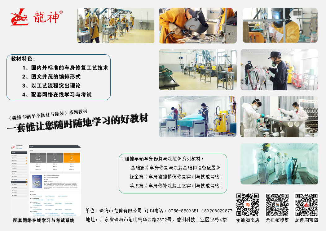 珠海市龍神有限公司2014年隆重巨獻(xiàn)《碰撞車輛車身修復(fù)與涂裝》系列教材:基礎(chǔ)篇《車身修復(fù)與涂裝基礎(chǔ)和設(shè)備配置》、鈑金篇《車身碰撞損傷修復(fù)實(shí)訓(xùn)與技能考核》、噴漆篇《車身修補(bǔ)涂裝工藝實(shí)訓(xùn)與技能考核》。