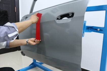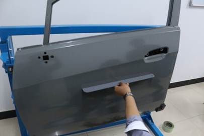 在40分鐘內(nèi),對(duì)雪佛蘭新賽歐左前門(mén)外板上的長(zhǎng)80mm,寬40mm,深10mm的條形凹陷(漆膜已破壞)進(jìn)行修復(fù),凹陷損傷穿過(guò)車身線。