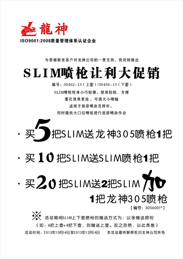 4)活動期間SLIM上下壺噴槍的贈送方式為:以多贈送原則(如:買6把上壺+4把下壺,贈送上壺。反之亦然,以此類推。)