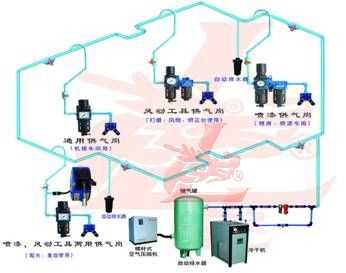 管道不生銹,不產(chǎn)生異味或有害氣體,外觀天藍(lán)色。 3)合理設(shè)計: 整個壓縮空氣主管路設(shè)計成全封閉環(huán)形,以保證各供氣點氣壓的均衡。并對主管路實行分區(qū) 分段控制 ,可在不停產(chǎn)的情況下進(jìn)行檢測及維護(hù)工作。