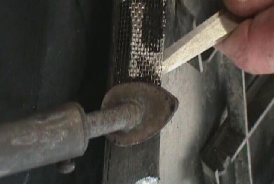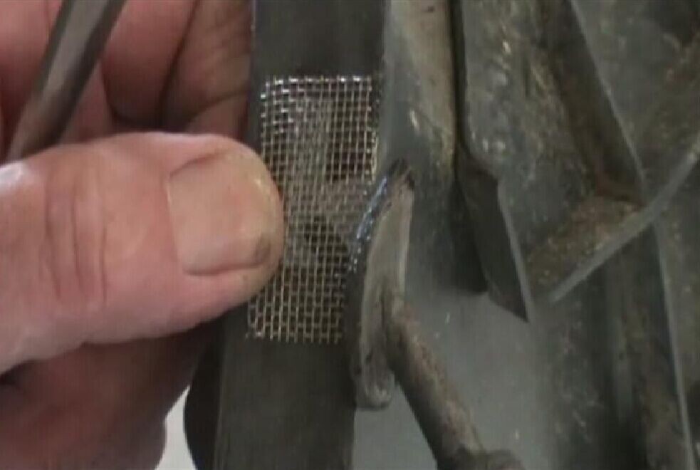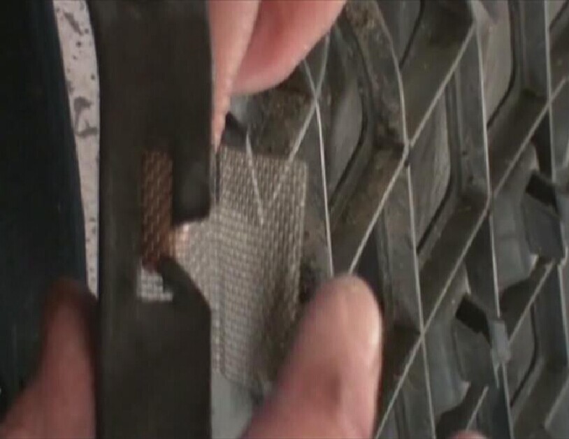 步驟6:把烙鐵按壓在加固網(wǎng)上加熱,并保持一定時間,使熔化的塑料將無銹加固網(wǎng)完全覆蓋,如圖1-6所示。注意要使覆蓋在無銹加固網(wǎng)周邊和折邊的熔膠具有一定厚度。