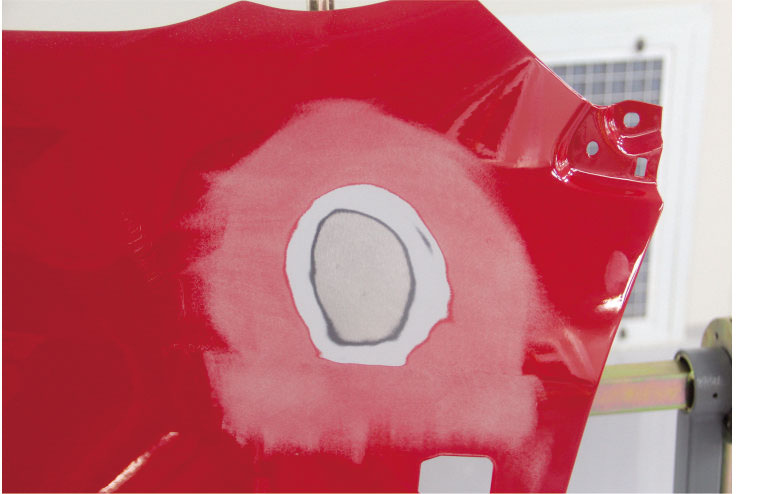 3. 施涂打磨指示劑后對原子灰區(qū)域進(jìn)行中間過渡打磨。