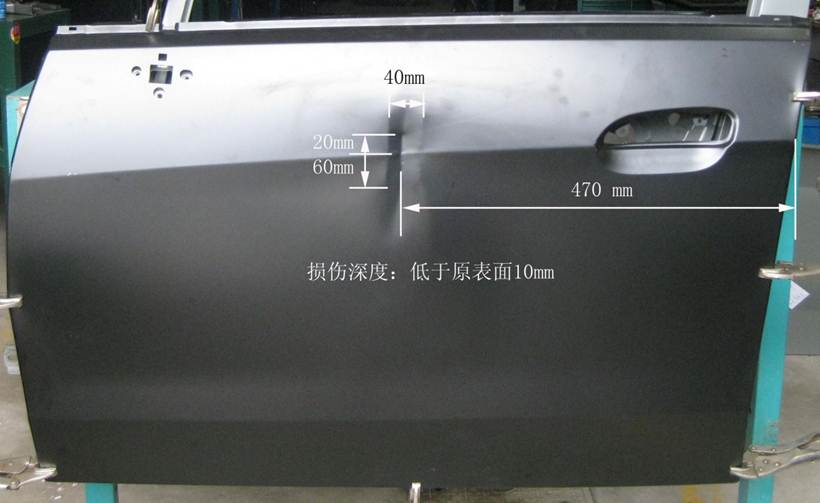 2013年車身修復(fù)大賽受損門板修復(fù)項目技術(shù)方案的補(bǔ)充說明 2013-05-16 19031 2013年車身修復(fù)大賽受損門板修復(fù)項目技術(shù)方案的補(bǔ)充說明 1、受損門板項目的受損位置及尺寸圖片、作業(yè)要求(1)作業(yè)要求在40分鐘內(nèi),對雪佛蘭新賽歐左前門外板上的長80mm,寬40mm,深10mm的條形凹陷(漆膜已破壞)進(jìn)行修復(fù),凹陷損傷穿過車身線。