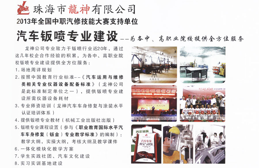 龍神汽車車身修復(fù)與涂裝 水平認(rèn)證培訓(xùn)體系 2013-06-03 25254 龍神公司專業(yè)致力于鈑噴行業(yè)近20年,通過這幾年校企合作經(jīng)驗的積累,為各中、高職業(yè)院校鈑噴專業(yè)建設(shè)提供全方位服務(wù)。