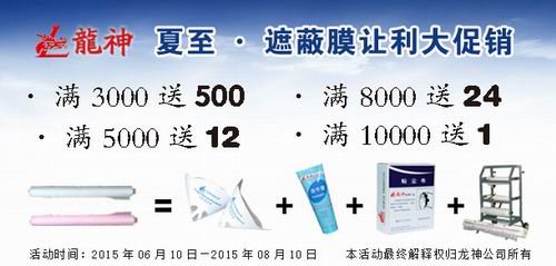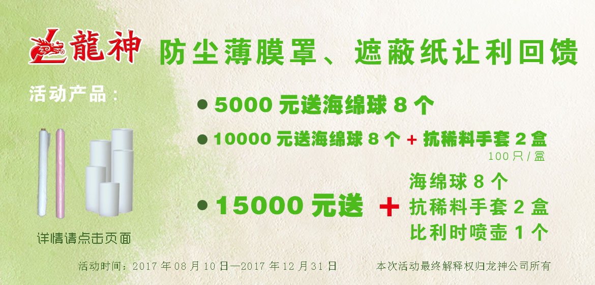夏季讓利大回饋,遮避膜優(yōu)惠大促銷 2015-06-05 30098 買滿3000元,贈送紙漏斗500個; 買滿5000元,贈送除漆洗手膏1箱; 買滿8000元,贈送標準抹塵布1箱/24盒; 買滿10000元,贈送小切紙架1臺 。