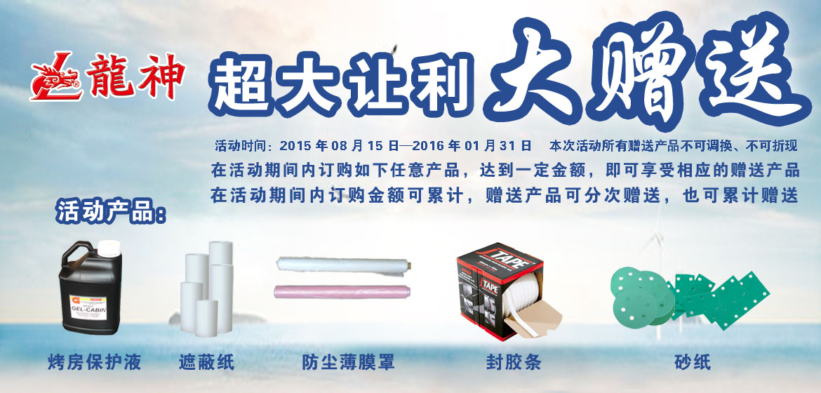 超大讓利﹒大贈送 2015-08-17 31798 訂購產(chǎn)品:1、烤房保護液; 2、遮蔽膜; 3、遮蔽紙; 4、泡沫膠條; 5、砂紙。 在活動期間內(nèi)訂購如上任意產(chǎn)品,達到下表累計金額,即可享受相應(yīng)的贈送產(chǎn)品。